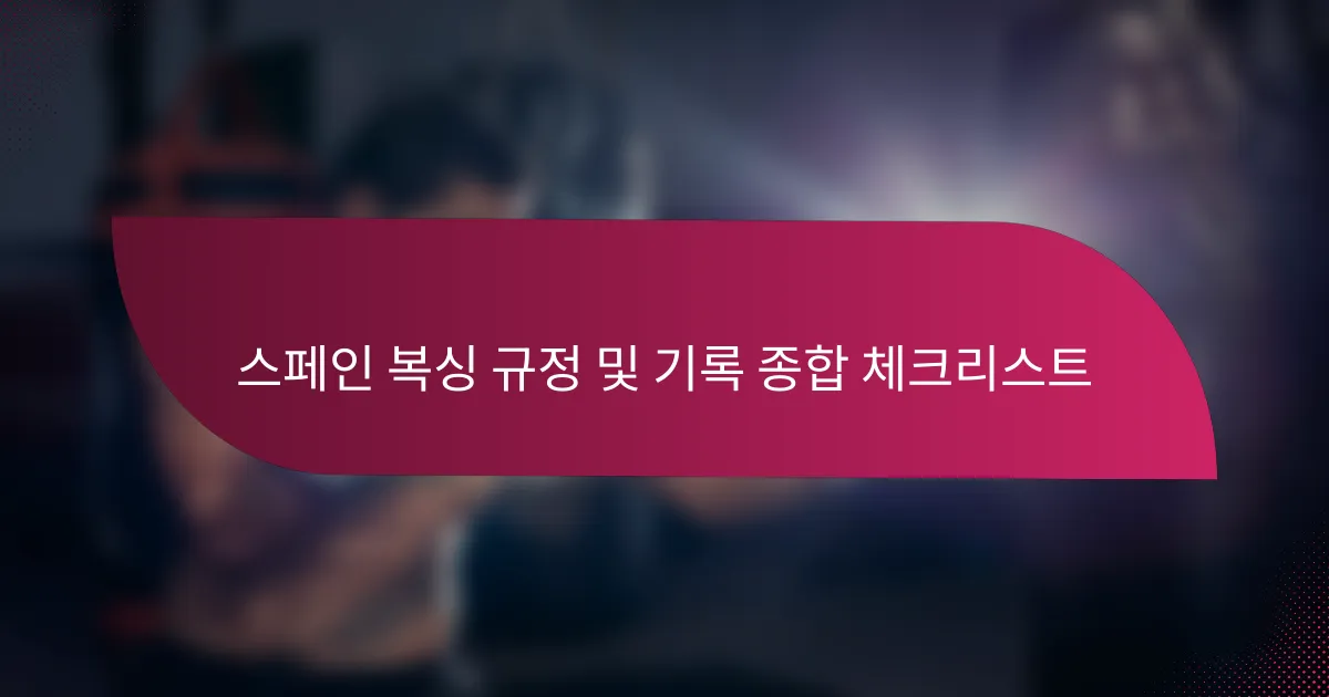이 포괄적인 체크리스트는 스페인에서 복싱을 규제하는 주요 규정과 기록을 설명하며, 주로 스페인 복싱 연맹(FEB)에 의해 설정됩니다. 이 체크리스트는 라이센스 발급, 체중 클래스, 안전 프로토콜 및 심사 기준과 같은 필수적인 측면을 다루어 공정한 경쟁과 참가자의 안전을 보장합니다. 또한, 공식 기관이 선수의 성과에 대한 정확한 기록을 유지하는 방법을 강조하며, 이는 순위 및 역사적 맥락에 매우 중요합니다.